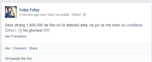 "Dacă strâng 1.000.000 de like-uri la statusul ăsta, vă jur că mă însor cu Loredana Chivu! Nu glumesc!", a scris Fulgy pe site-ul de socializare. Tu îi dai like?