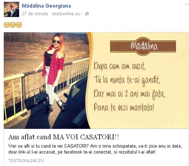 Mădălina de la "Mireasă pentru fiul meu" a căzut şi ea capcanăjoculeţelor virale. Tânăra şi-a făcut un test în urma căruia a aflat că se va mărita peste doi ani.