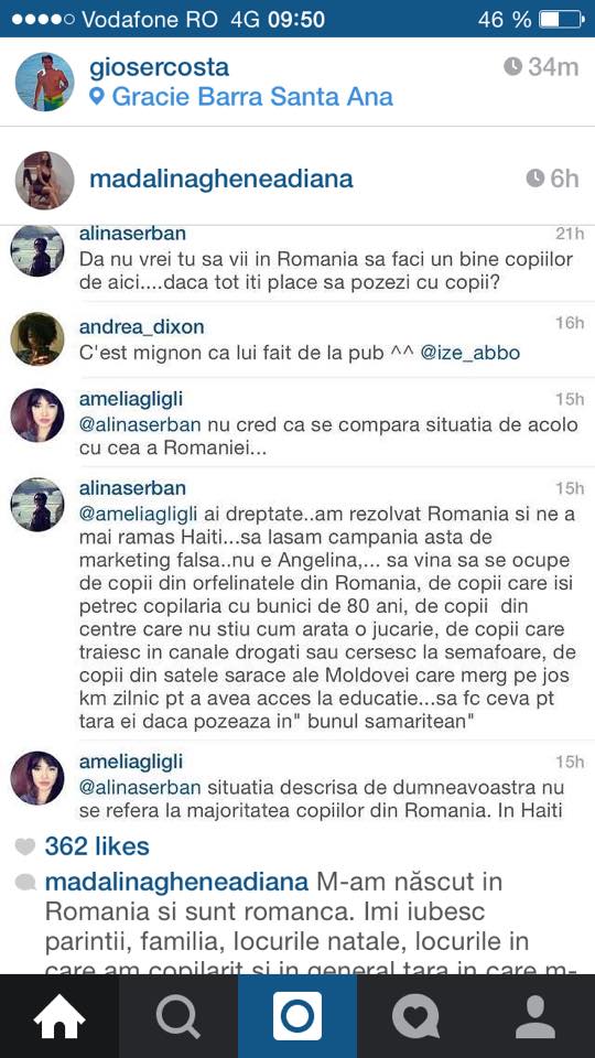 Mădălina Ghenea este revoltată de criticile care i-au fost aduse în România şi de faptul că munca ei umanitară şi campaniile în care se implică în ţările din lumea a treia nu îi sunt apreciate. Deranjată de faptul că presa speculează pe seama vieţii ei amoroase, deşi acesta este un risc pe care orice vedetă de talie de renume internaţional şi-l asumă, dar şi de faptul că românii au pus-o la zid pe motiv că nu desfăşoară campanii umanitare şi în ţara ei natală, românca a izbucnit.