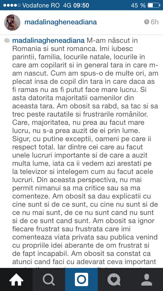 "M-am născut în România şi sunt româncă. Îmi iubesc părinţii, familia şi locurile natale (...) Am obosit să rabd, să tac şi să trec peste răutăţile şi frustrările românilor care, majoritatea, nu prea au făcut mare lucru, nu s-a auzit de ei prin lume. (...) Din această perspectivă, nu mai permit nimănui să mă critice sau să comenteze.