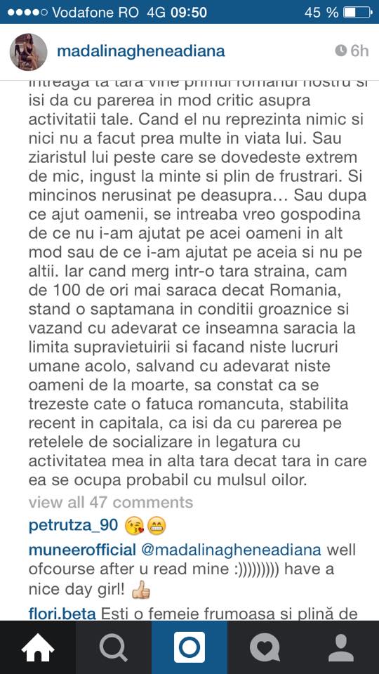 Am obosit să dau explicaţii cu cine sunt şi de ce sunt, cu cine nu sunt şi de ce nu mai sunt (...) Sau după ce ajut oamenii se întreabă câte o gospodină de ce nu i-am ajutat pe acei oameni în alt mod sau de ce i-am ajutat pe aceia şi nu pe alţii (...) Iar atunci când merg într-o ţară de 100 de ori mai săracă decât România şi stau în condiţii groaznice şi fac nişte lucruri umane, se trezeşte câte o fătucă româncuţă, stabilită recent în Capitală, că îşi dă cu părerea pe reţelele de socializare, în legătură cu activitatea mea în altă ţară, decât ţara în care ea se ocupă, cel mai probabil, cu mulsul oilor", a fost mesajul transmis de Mădălina Ghenea, la adresa conaţionalilor ei.