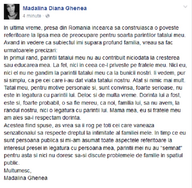 Acestea fiind spuse, aş vrea să îi rog pe toţi cei care vânează senzaţionalul să respecte dreptul la intimitate al familiei mele. În timp ce eu sunt persoană publică şi mi-am asumat toate aspectele referitoare la interesul presei în legatură cu persoana mea, părinţii mei nu au “semnat” pentru asta şi nici nu doresc să-şi discute problemele de familie în spaţiul public", a scris Mădălina Ghenea pe o reţea de socializare.