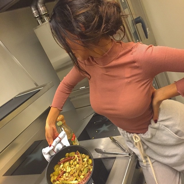 De curând, aceasta a postat pe o reţea de socializare o fotografie în care apare în bucătărie, gătind cârnaţi cu legume trase la tigaie.