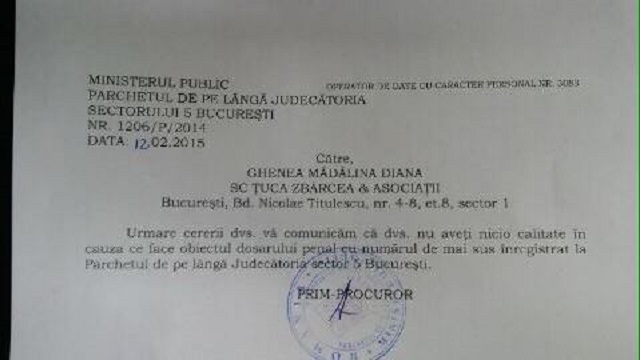 "Public mai jos confirmarea scrisă a Parchetului de pe lângă Judecătoria Sectorului 5 București cu privire la lipsa oricărei legături a persoanei mele cu dosarul penal nr. 1206/P/2014 . Documentul dovedește caracterul calomnios și profund nedrept al asocierilor pe care diferite publicații le-au realizat în ceea ce privește persoana mea și scandalul sus amintit. Procedând în acest fel, aceste publicații au încălcat cel puțin 2 obligații profesionale minimale ale oricărui jurnalist: