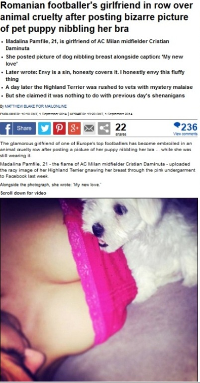 Jurnaliștii de la dailymail.co.uk o acuză pe Mădălina de cruzime faţă de animale, după ce a publicat imaginea în care cățelul o muşca de sutien.