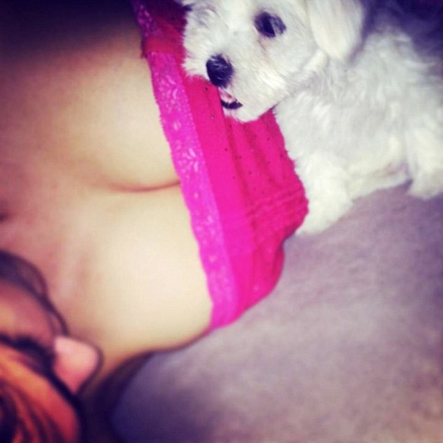 Fanii vedetei de pe Facebook au acuzat-o că din cauza sutienului, câinele a început să se simtă rău, iar ea le-a răspuns: "Nu a mâncat sutienul, doar l-a muşcat puţin, apoi s-a plictisit de el".