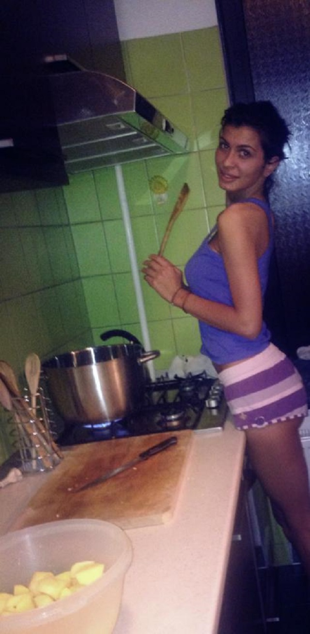 Cu părul prins, faţa fără urmă de machiaj, Mădălina s-a pus pe gătit. Ca o gospodină ce se respectă, stă lângă oala cu mâncare cu o lingură de lemn în mână, fiind pregătită să amestece şi să guste rezultatul muncii sale. Hmm, oare bruneta are planuri de măritiş, sau pur şi simplu este pasionată de gătit?