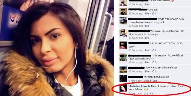 Madalina Pamfile a postat pe internet o fotografie din metrou, îmbrăcată într-o ţinută lejeră şi discret machiată. Până aici toate bune, însă atunci când a fost întrebată dacă este în metrou şi dacă ascultă manele, modelul a dat un răspuns neaşteptat. "Fă sunt în metrou şi ascultam Laura Fabian", a scris Mădălina pe Facebook, alături de fotografia cu pricina. Dacă pentru confuzia Larei Fabian cu "Laura Fabian" putem trece, peste limbajul rupt de pe maidan... este mai greu.