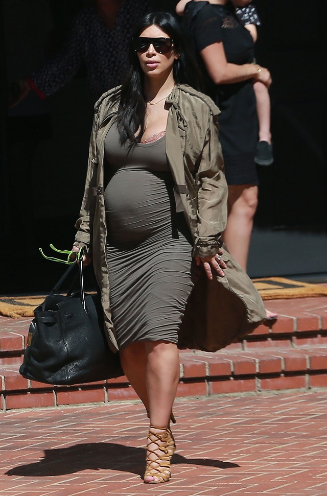 Kim Kardashian se măreşte pe zi ce trece! Burtica de graviduţă a vedetei creşte văzând cu ochii. Aceasta şi-a etalat formele într-o rochie vernil, mulată.