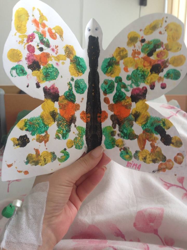 Mara Bănică a avut parte de o surpriză direct pe patul de spital. Fiul ei i-a pictat un fluturaş şi i l-a trimis la spital, printr-un intermediar, pentru a o face să treacă mai repede peste impas. "Piticul meu a aflat că mami e la spital şi i-a trimis un fluturaş făcut de el", a scris Mara pe contul de Facebook, alături de poza cu pricina.