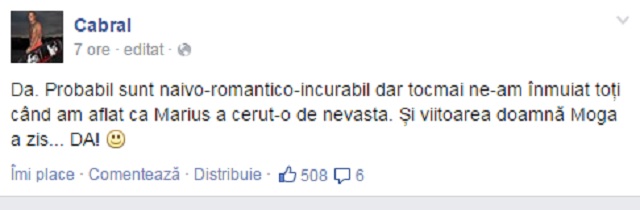 Cabral a fost cel care a scris pe contul lui de Facebook despre fericitul eveniment, iar prezentatorul TV s-a simţit extrem de emoţionat de întregul moment.
