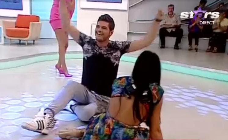 Nici Raluca nu s-a lăsat mai prejos... s-a lăsat pe jos. Aceasta împreună cu Răzvan s-au tăvălit puţin prin platou, în timp ce Rocsana Marcu îi privea uimită.