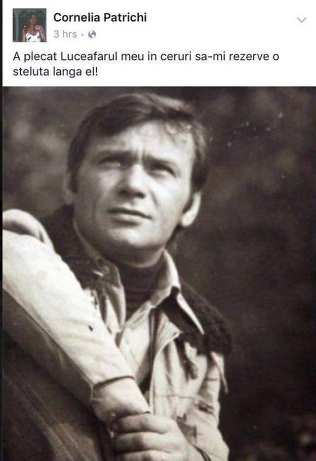"A plecat Luceafărul meu în ceruri să-mi rezertve o steluţă lângă el", a scris Cornelia Patrichi pe o reţea de socializare.