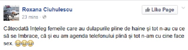 Roxana Ciuhulescu i-a surprins pe amicii ei de pe Facebook. S-a trezit dis-de-dimineaţă şi s-a plâns, într-un mesaj, că n-are cu cine să facă sex.