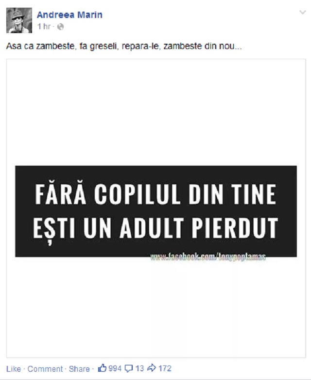 Homepage » Monden » Mesajul cu care Andreea Marin i-a făcut pe toţi să-i dea like! "Eşti un adult pierdut dacă..."