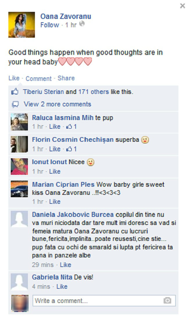 "Lucrurile bune se întâmplă atunci când în mintea ta sunt gânduri bune", a scris Oana, pe Facebook. Fanii i-au dat like şi i-au spus că e foarte frumoasă, mulţi dintre admiratorii invitând-o să petreacă o noapte cu ei