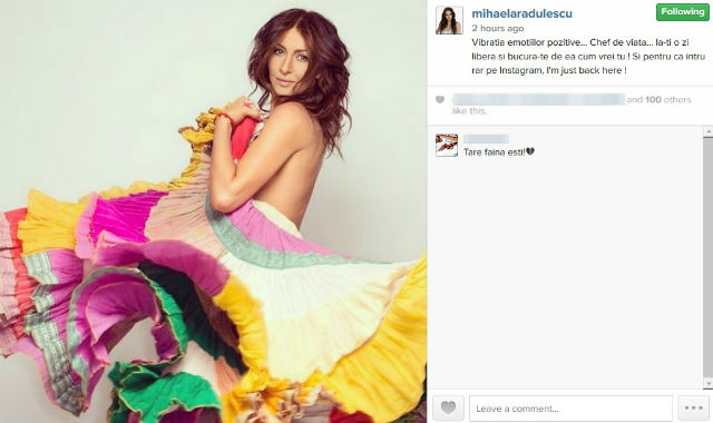Acum, însă, la doar o sătpămână de la tragicul eveniment, Mihaela Rădulescu sugerează, pe Instagram, că a trecut peste durere şi a redevenit încrezătoare şi cu poftă de viaţă. Mai mult, vedeta a renunţat şi la doliu, publicând o imagine în care apare îmrbăcată doar cu o fustă largă, colorată, precum cele ale femeilor rome. "Vibraţia emoţiilor pozitive. Chef de viaţă. Ia-ţi o zi liberă şi bucură-te de ea cum vrei tu", a scris Mihaela Rădulescu, pe Instagram.