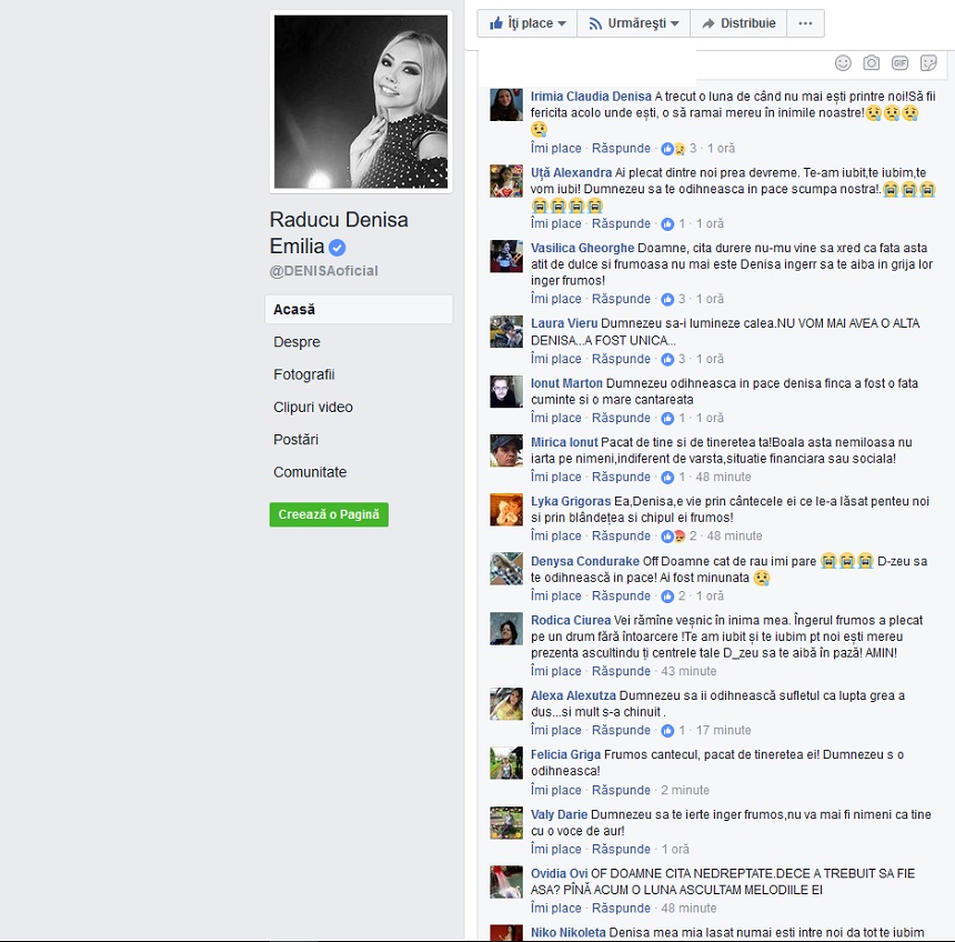 Cu cât timpul trece, durerea este mai profundă în sufletele apropiaţilor şi a celor care te-au apreciat, frumoasa noastră artistă, Răducu Denisa Emilia! Domnul să te aibe în paza Lui! #EchipaDenisaMusic 🙏 #DorDeTine ❤ #Denisa 🙏 RIP 🙏 #23IULIE", a scris familia regretatei cântăreţe pe pagina ei oficială de Facebook.