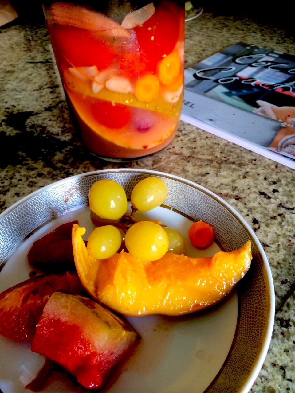 Așa că, luând lecții de la maestrele din familie, am decis să improvizez și să împrietenesc, în același borcan, roșia cu pruna, usturoiul cu mango, felia de pepene roșu cu morcovul, merele cu mărarul uscat, sarea cu portocala, un amărât de ardei aprig cu un ciorchine de strugure și, dupa acest patchwork de culori și arome, am așteptat cuminte să-și facă o relație trainică și iute.