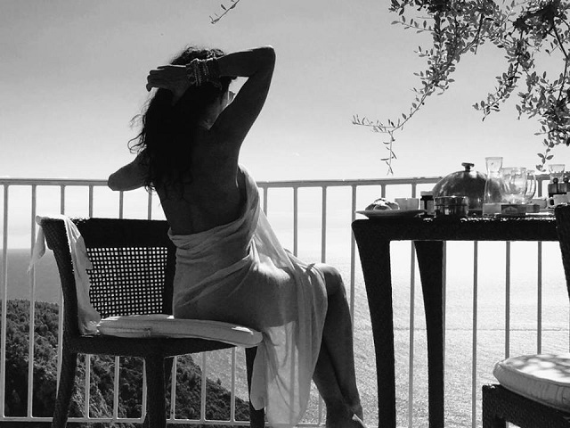 Într-un un decor familial şi o privelişte ameţitoare, Felix a fotografiat-o pe Mihaela Rădulescu aşa cum se bucură s-o vadă în fiecare dimineaţă. Cadrul este intim, iar detaliile lăsate la vedere dau dovadă de o vacanţă de milioane: departe de ochii curioşilor şi cât mai aproape unul de celălalt. Mihaela se scaldă în razele calde ale soarelui, după o seară în care braţele soţului ei i-au ţinut de cald. Aceasta este acoperită de un cearceaf ce stă să cadă şi priveşte spre orizont.