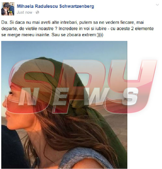 "Da. Şi dacă nu mai aveţi alte întrebări, putem să ne vedem, fiecare, mai departe, de vieţile noastre? Încredere în voi şi iubire - cu aceste două elemente se merge mereu înainte. Sau se zboară extrem", a scris Mihaela Rădulescu, pe contul ei de Facebook.