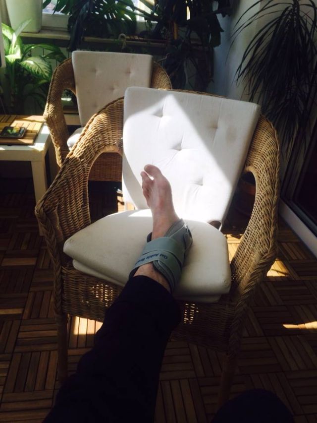 Designerul a postat o imagine cu piciorul accidentat pe pagina sa de Facebook. Se relaxează, odihnindu-şi piciorul accident pe un scaun.