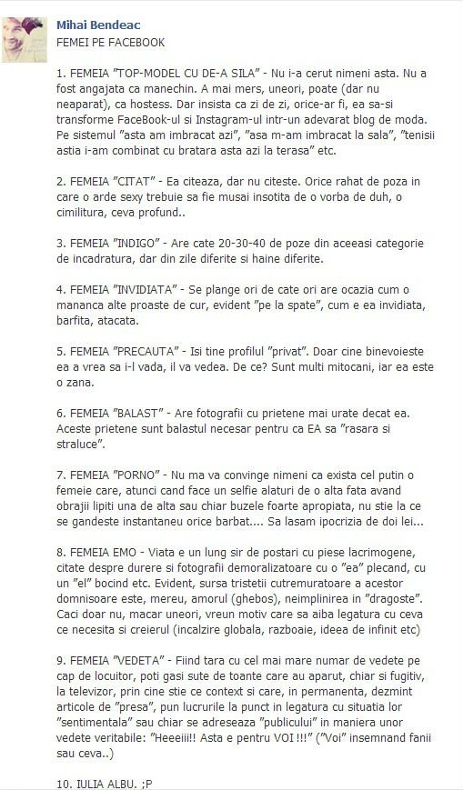 Homepage » Monden » Mihai Bendeac desfiinţează femeile de pe Facebook! Uite ce top a realizat actorul! Tu unde te încadrezi?