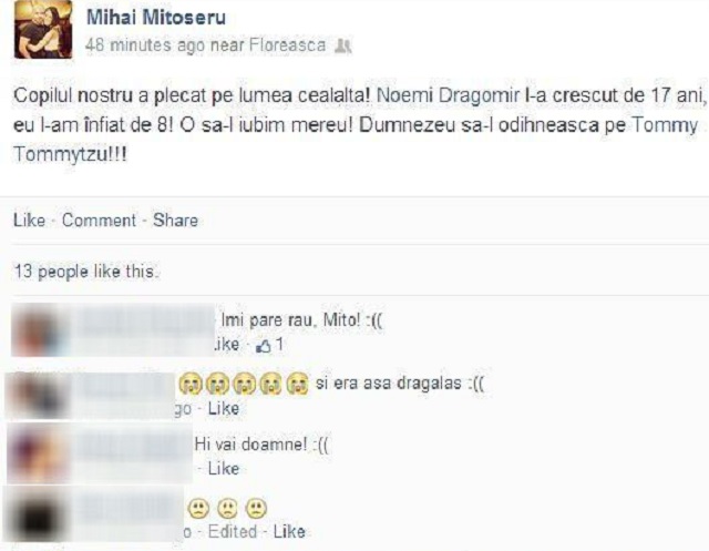 Mihai Mitoşeru a postat, recent, pe pagina personală de Facebook că Tommy a murit. "Copilul nostru a plecat pe lumea cealaltă! Noemi Dragomir l-a crescut de 17 ani, eu l-am înfiat de 8! O sa-l iubim mereu! Dumnezeu sa-l odihneasca pe Tommy", scrie Mihai Mitoşeru pe contul de socializare. Prietenii din mediul virtual i-au înţeles suferinţa prezentatorului TV şi au încercat să îl îmbărbăteze.