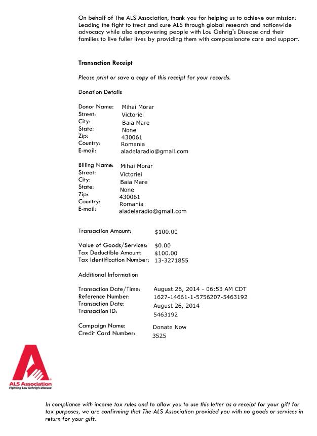 Da, am făcut această donație în contul unei asociații din Statele Unite, organizația de unde a pornit această campanie. Voi fi tras de urechi că am scos banii în afara țării. Vă reamintesc că este o donație care ajută cercetarea pentru găsirea unui tratament pentru vindecarea completă a sclerozei laterale amiotrofice. Deci nu e un ajutor pentru "străini", e un ajutor pentru toți pacienții care așteaptă o minune. Inclusiv cei din România.