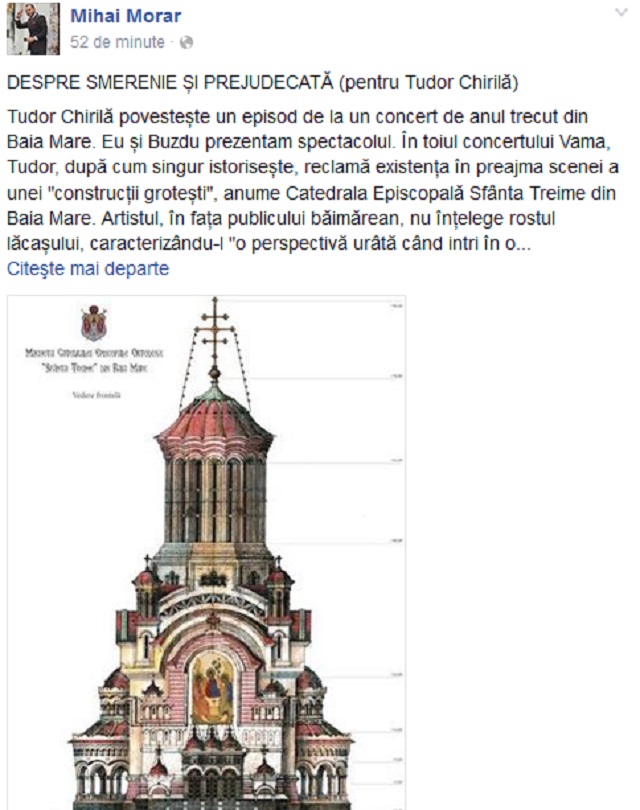 Mihai Morar a luat atitudine în legătură cu mesajul postat de Tudor Chirilă referitor la construirea Catedralei Neamului. Realizatorul TV i-a adresat artistului o scrisoare deschisă în care-i semnalează faptul că nu este informat întru totul cu subiectul dezbătut.