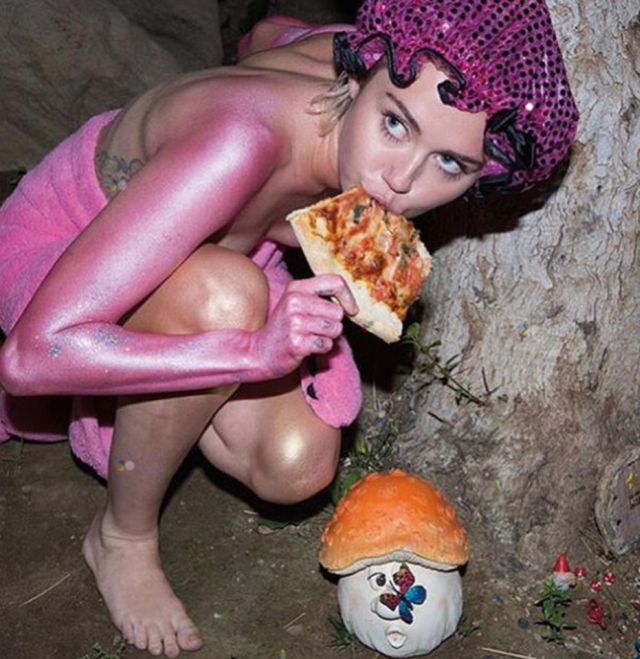 În ultima fotografie pe care a postat-o pe reţeaua de socializare Insagram, artista apare îmbrăcată doar într-un prosop roz, vopsită cu cu roz pe mâini, muşcând cu poftă dintr-o felie de pizza.