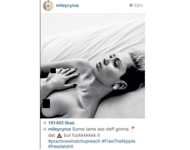De curând, Miley a publicat o fotografie pe contul ei de Instagram, surprinsă topless, întinsă pe un pat. Chiar dacă sfârcurile ei au fost cenzurate de o bandă neagră, fanii artistei nu au putut să nu remarce faptul că bustul acesteia s-a mărit considerabil, fără să-şi piardă, însă, din aspectul natural.