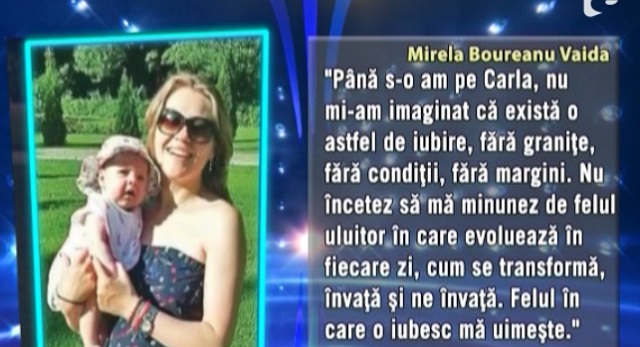 Până s-o am pe Carla nu mi-am imaginat că există o astfel de iubire, fără graniţe, fără condiţii, fără margini. Nu încetez să mă minunez de felul uluitor în care evoluează în fiecare zi, cum se transformă, învaţă şi ne învaţă. Felul în care o iubesc mă uimeşte", a declarat Mirela Boureanu Vaida, potrivit emisiunii "Acces direct", de la Antena 1.