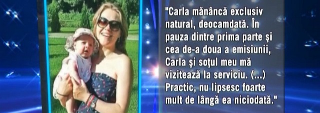 "Carla mănâncă exclusiv natural deocamdată. În pauza dintre prima parte şi cea de-a doua parte a emisiunii, Carla şi soţul meu mă vizitează la serviciu. Practic, nu lipsesc foarte mult de lângă ea niciodată.