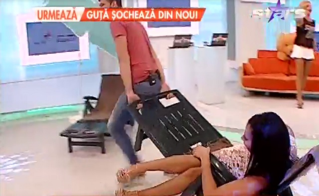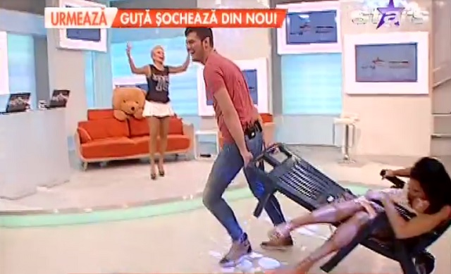 În această dimineaţă, platoul "Star Matinal" a devenit "derdeluş", doar că în loc de sanie, "instrumentul distracţiei" a fost... un şezlong. Raluca Dumitru a fost fericita câştigătoare a unei plimbări matinale. S-a ţinut bine pe poziţie în timp ce Bote a plimbat-o prin platou.