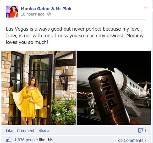 "Las Vegas arată întotdeauna bine, dar niciodată nu e perfect pentru că iubirea mea, Irina, nu este lângă mine. Îmi este atât de dor de tine, draga mea. Mama te iubeşte foarte mult!", a scris Monica Gabor pe site-ul de socilizare.