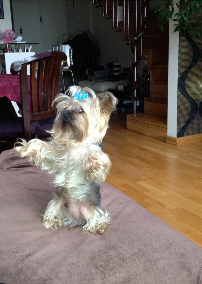 Cu agrafă albastră în blană, patrupedul pare că dansează concentrat paşii pe care i-a învăţat de la stăpâna sa. Actriţa porno a fost fascinată de aptitudinile micului câine, aşa că l-a fotografiat şi l-a arătat fanilor săi, pe contul ei de socializare. Se pare că poziţia de yoga a animalului i-a înduioşat pe admiratorii Jasminei, care au sărit cu comentarii apreciative la adresa lui.