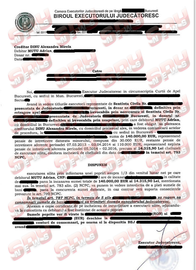 Un document secret, emis de un birou de executori judecătorești din București, demonstrează că Alexandra Dinu s-a săturat să aștepte bunăvoința lui Adrian Mutu când vine vorba de fiul lor, Mario, și de banii pe care fotbalistul îi datorează. Mai exact, conform actului emis de respectivul birou de executori, ”Briliantul” trebuie să îi dea Alexandrei Dinu suma de 140.000 de euro, adică pensia alimentară datorată de ”Briliant” lui Mario din ultimii trei ani, sumă la care se adaugă 14.315 lei, cheltuielile de executare silită. Mai mult decât atât, în aceste momente, Adrian Mutu are veniturile poprite prin respectiva decizie, urmând ca poprirea pusă să fie ridicată abia în momentul în care datoriile ”Briliantului” vor fi achitate în totalitate, conform unei decizii definitive emisă la sfârșitul lunii martie de Judecătorie. Iar până în acest moment, Adrian Mutu nu a contestat sau a cerut suspendarea acestui ordin, ceea ce va însemna că, timp de 43 de luni, dacă salariul lui va rămâne același, va fi nevoit să tot plătească restectivii bani.