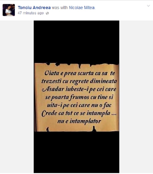 Bruneta crede că nimic din ceea ce ni se întâmplă nu e întâmplător şi că viaţa e mult prea scurtă pentru a mai avea şi regrete. "Iubeşte-i pe cei care se poartă frumos cu tine şi uită-i pe cei care nu o fac", a scris Andreea. Pe contul ei de socializare apare că se afla alături de Nicolae Mitea cât a publicata cest mesaj, semn că cei doi se înţeleg de minune şi gândesc la fel. A primit o mulţime de like-uri în doar câteva minute de la postarea acestui mesaj.