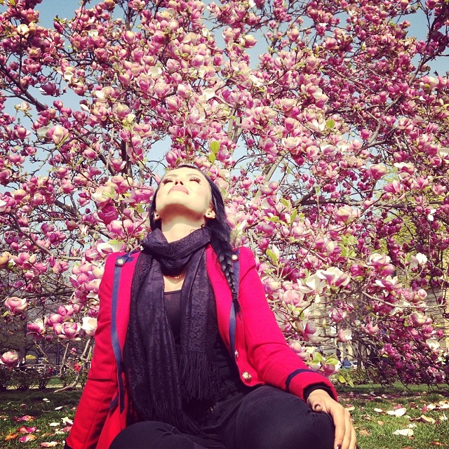 Bruneta a postat o fotografie pe contul de Instagram în care se află în parc, s-a aşezat pe iarbă, iar razele soarelui îi mângâie chipul. Andreea este înconjurată de flori şi probabil că se simte bine în compania celui care i-a făcut poza.