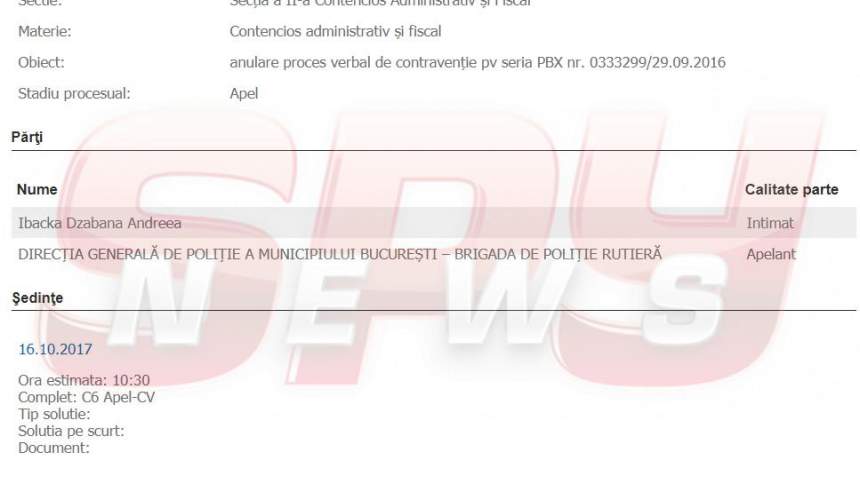 Magistraţii Tribunalului Bucureşti decid, astăzi, dacă soţia lui Cabral scapă de o amendă primită în urmă cu un an, pe care vedeta a contestat-o. În prima instanţă, Andreea Ibacka a câştigat procesul, însă Poliţia Rutieră a atacat sentinţa, aşa că totul depinde acum de judecătorii de la Tribunalul Bucureşti. "Admite plângerea. Anulează procesul-verbal seria PBX, nr. 0333299/29.09.2016 şi înlătură sancţiunile dispuse. Cu drept de apel în termen de 30 de zile de la comunicare", au dispus magistraţii de la judecătorie, în hotărârea atacată.