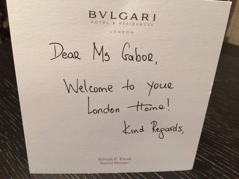 "Dragă, domnşoară Gabor, bine aţi venit în Londra. Simţiţi-vă ca acasă! Toate cele bune",a fost mesajul managerului hotelului de lux.