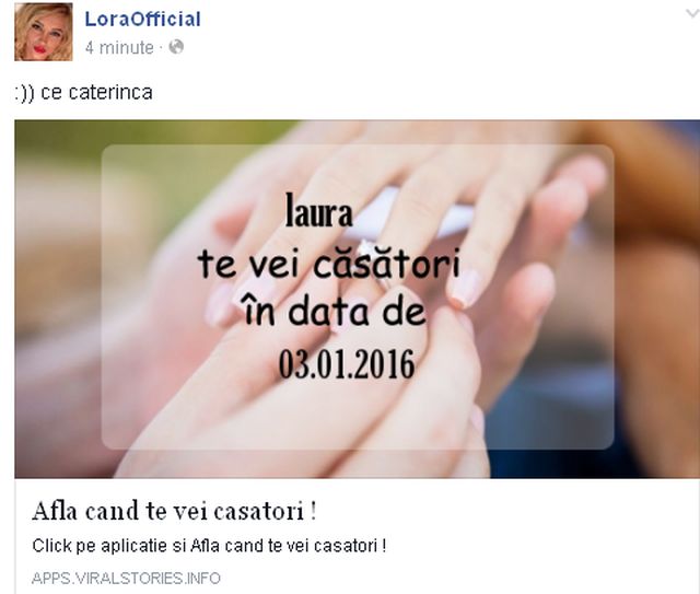 Vedeta şi-a făcut un joculeţ care-i arată când se va căsători din nou. Potrivit rezultatului jocului, Lora ar urma să se căsătorească pentru a doua oară în martie 2016. Vedeta s-a amuzat teribil de vestea pe care a aflat-o şi s-a gândit s-o împărtăşească şi prietenilor ei virtuali.