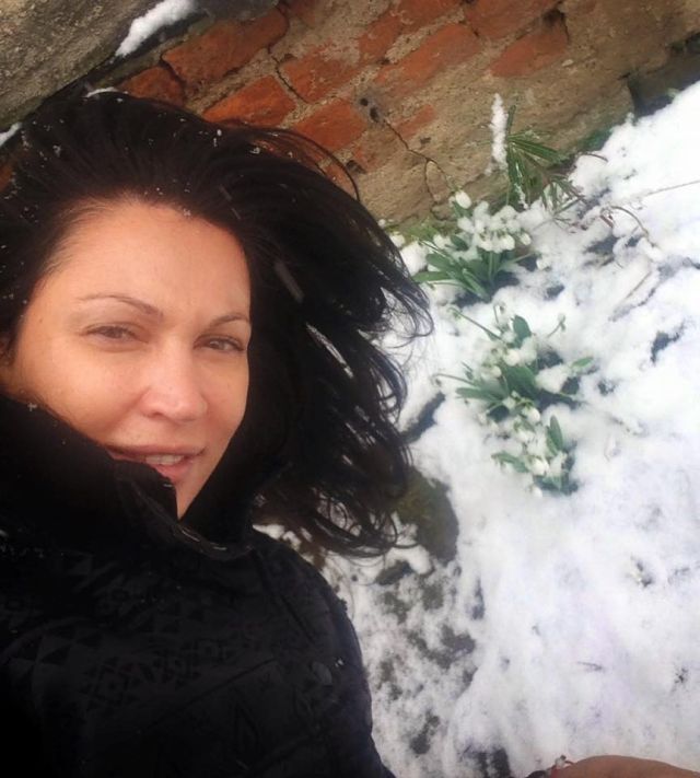 Focoasa brunetă apare, într-o fotografie făcută în curtea casei, fără pic de machiaj pe chip. Diferenţele sunt vizibile.