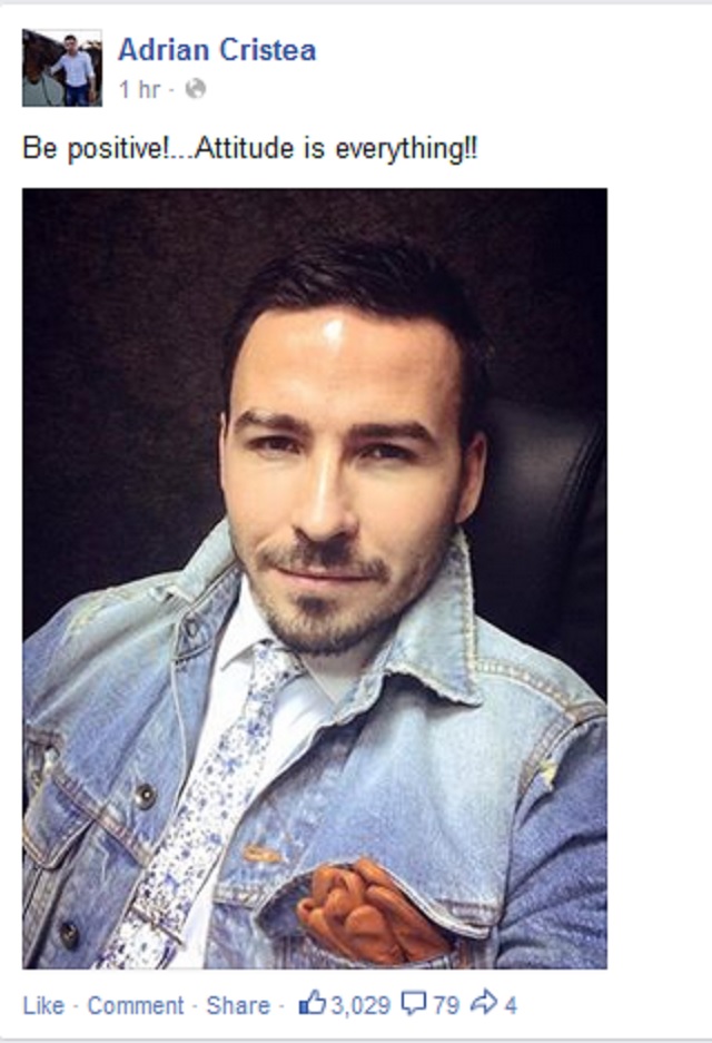 De când s-a despărţit de Victor, Bianca scrie des, pe contul de socializare, mesaje despre viaţă şi cât de important e să fii optimist ca să reuşeşti. Recent, Adrian Cristea a început să facă acelaşi lucru. "Fii pozitiv! Atitudinea e totul!", le-a scris fotbalistul prietenilor săi de pe contul de socializare.