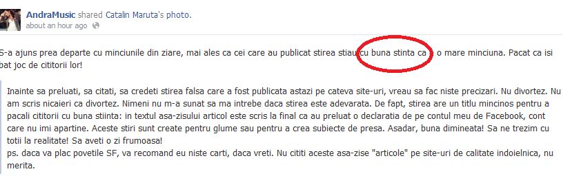 Cântăreaţa este tânără, frumoasă şi de succes, dar pare că a cam chiulit la orele de română. Supărată din cauza informaţiilor false apărute în presă, conform cărora ar divorţa de Cătălin Măruţă, Andra a comis-o pe Facebook.