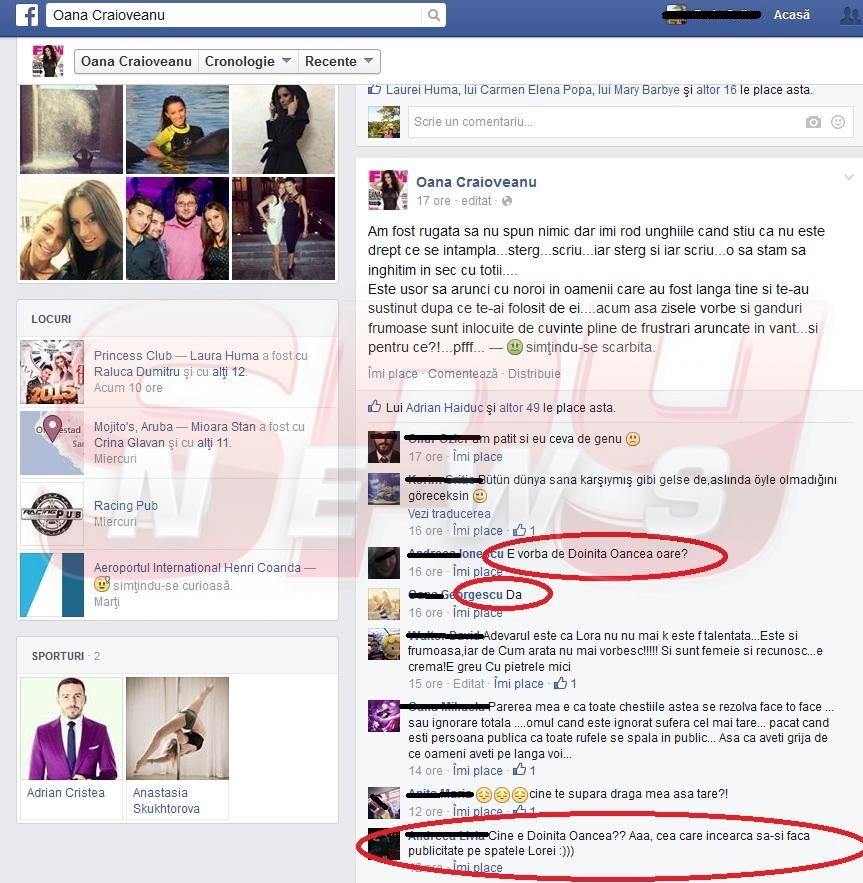 ”Am fost rugată să nu spun nimic, dar îmi rod unghiile când știu că nu este drept ce se întâmplă... șterg... scriu... iar șterg și iar scriu... o să stăm să înghițim în sec cu toții.... Este ușor să arunci cu noroi în oamenii care au fost lângă tine și te-au susținut după ce te-ai folosit de ei... acum așa-zisele vorbe și gânduri frumoase sunt înlocuite de cuvinte pline de frustrări aruncate în vânt... și pentru ce?!... pfff... — simţindu-se scârbită”, sunt cele scrise de Oana pe contul ei de socializare, loc în care amicele acesteia au indicat-o, fără niciun fel de diplomație, pe Doinița Oancea ca fiind cea la care se referă autoarea.
