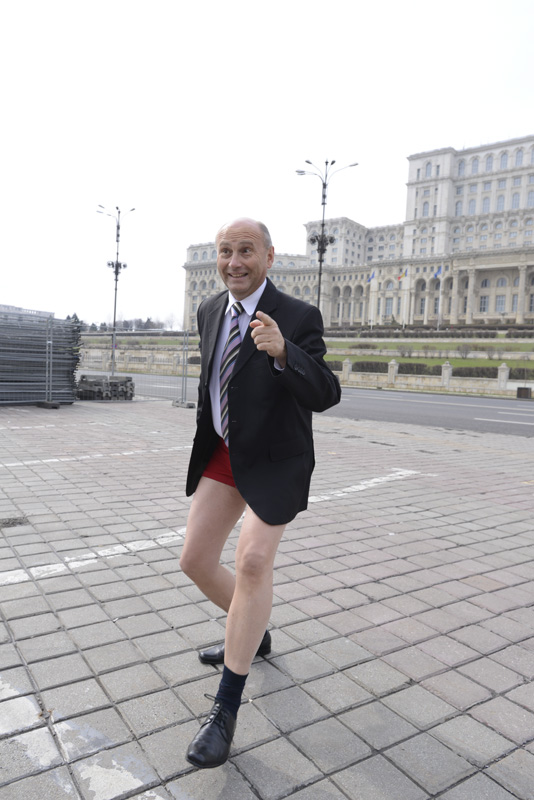 În faţa Palatului Parlamentului, membrii SRC au dat boxele la maxim, însă deşi deputaţii şi senatorii nu se aflau la serviciu, “preşedintele” a fost prezent la filmări. Fără fără gardă de corp cel mai mare om din stat a dansat pe rupte pe ritmurile hit-ului “Happy” doar în chiloţi roşii.