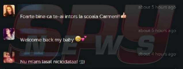 Carmen a postat o poză pe un cont de socializare în care se află în clasă şi şi-a făcut un selfie de toată frumuseţea. "Înapoi la şcoală", a scris ea la descrierea fotografiei. Prietenele ei i-au spus că a făcut foarte bine că s-a întors la şcoală, iar ea le-a răspuns râzând: "Nu m-am lăsat niciodată".