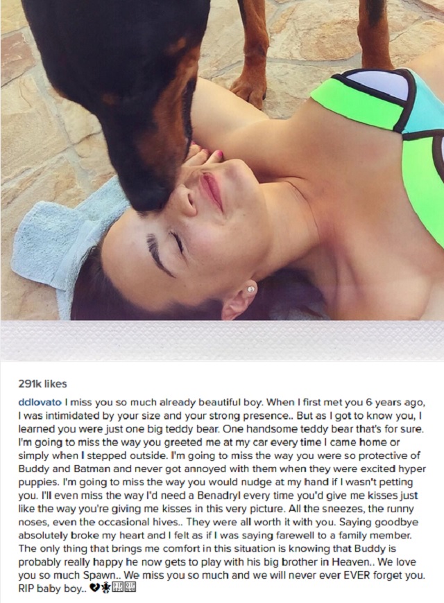"Deja îmi lipseşti atât de mult, băiat frumos. Când te-am întâlnit prima dată, în urmă cu 6 ani, am fost intimidată de mărimea ta şi de prezenţa ta puternică. Dar imediat ce te-am cunoscut, am descoperit că eşti doar un urs mare. Un ursuleţ frumos cu siguranţă. O să-mi lipsească felul în care mă aşteptai la maşină de fiecare dată când veneam acasă sau cum mă conduceai atunci când plecam. O să-mi lipsească felul protector în care te purtai cu Buddy şi Batman şi felul în care nu te-ai supărat niciodată atunci când erau super-agitaţi fiind doar nişte căţeluşi. [...] O să ne lipseşti atât de mult şi niciodată nu o să te uităm. Odihneşte-te în pace, băieţelule", este mesajul postat de Demi Lovato în memoria căţelului ei mult iubit.